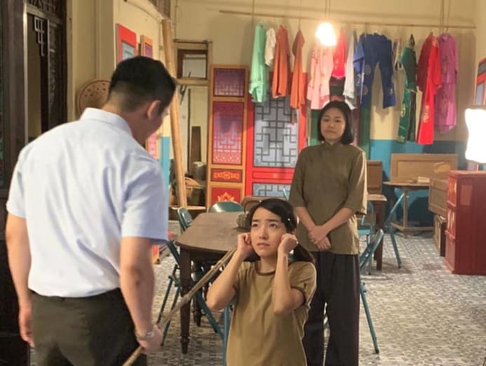 No pain, no cane: In this scene, Koe Yeet's Ah Chiam is punished by her sifu, played by Nick Shen. Koe Yeet admits that she got hit a few times for real. Because she was wearing protective padding, it didn't hurt that much. Nick was very good — it looked like he actually hit me because of his hand movements, but the strokes landed softly.