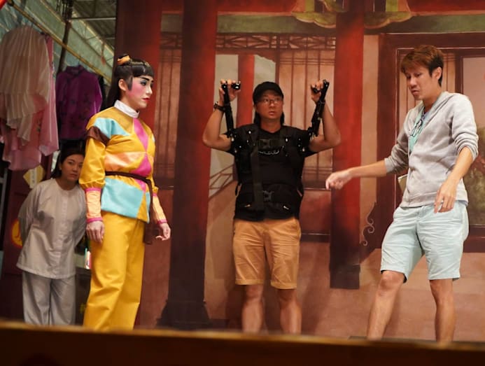 Let's wayang a bit: Koe Yeet going through her stage action with the director. After doing 'Titoudao', Koe Yeet can speak a bit of Hokkien now. My dialect group is Kwongsai, so I was never really good at it, she says. In KL, no one speaks Hokkien. My mum speaks it but my dad doesn't understand it.