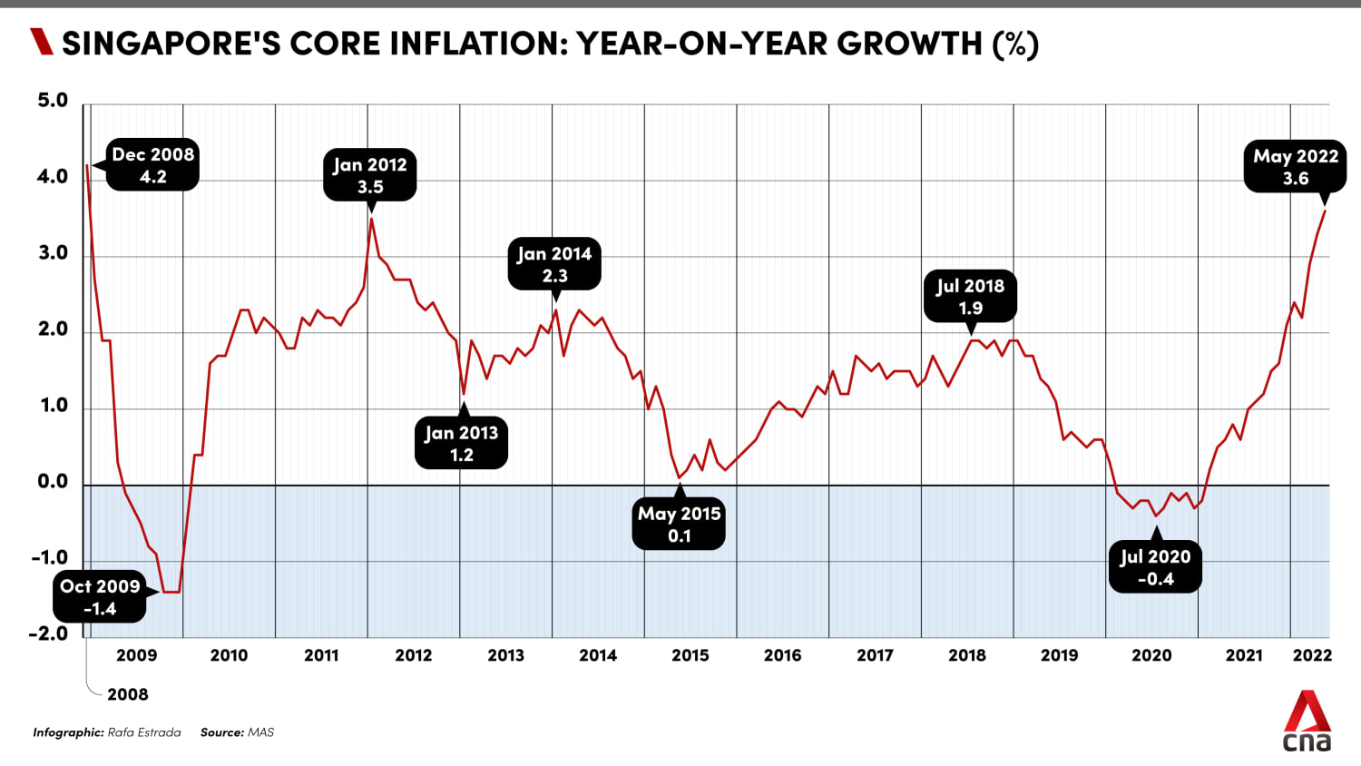 Core inflation, which excludes accommodation and private transport costs, came in at 3.6 per cent year-on-year in May, up from a previous 10-year high of 3.3 per cent in April, official data released on Thursday (Jun 23) showed.