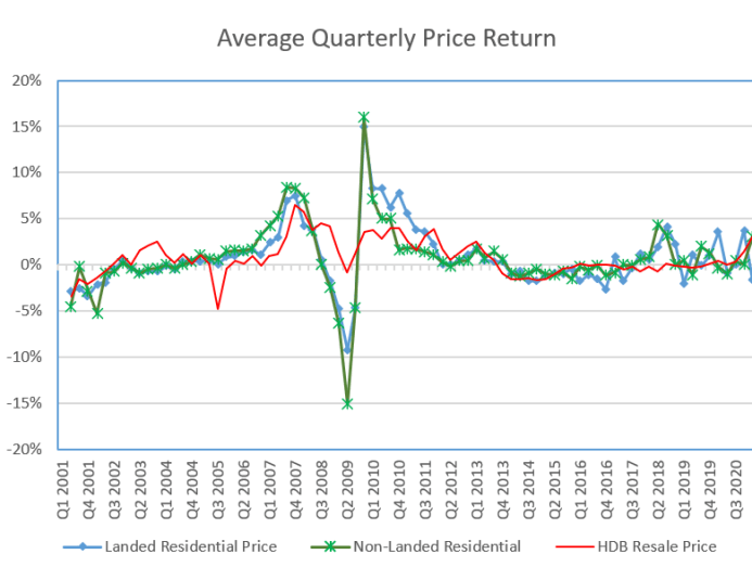During this period, the resale public housing prices grew at 0.82 per cent per quarter on average, or an accumulated growth of nearly 70 per cent. Private landed, and non-landed residential property price indices have increased by 71.5 per cent and 58.0 per cent, respectively in this same time.