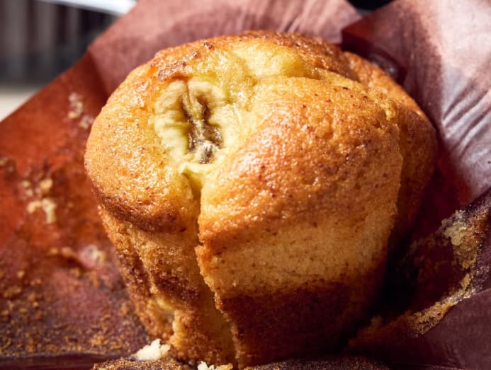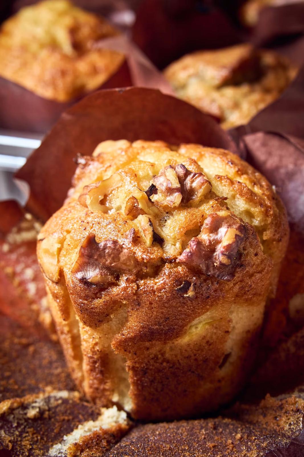 Unlike typical banana bakes that use mashed overripe bananas, this muffin incorporates fresh banana slices that create pockets of tangy sweetness. The walnuts are well-roasted, adding a satisfying crunch and earthy tone to the moist crumb.