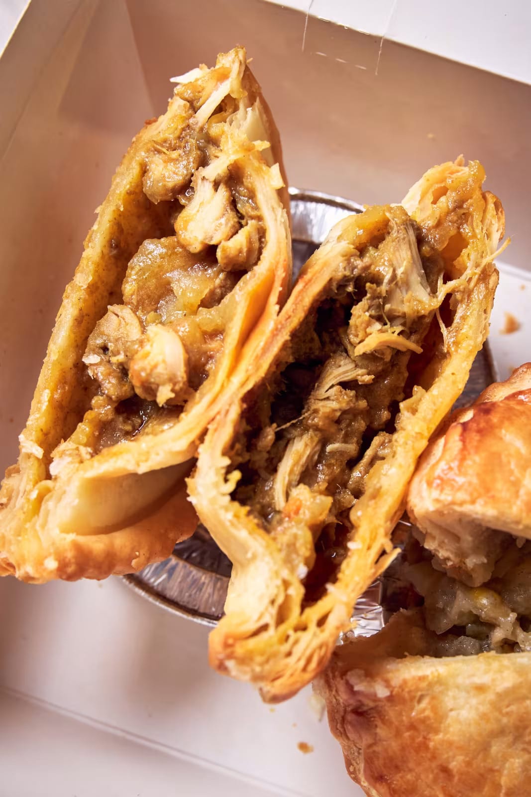 For savoury snacks, this flaky pastry houses tender chicken and potato chunks seasoned with aromatic if mild rendang spices. The perfectly flaky crust holds together well, providing a satisfying contrast to the stew-like filling.