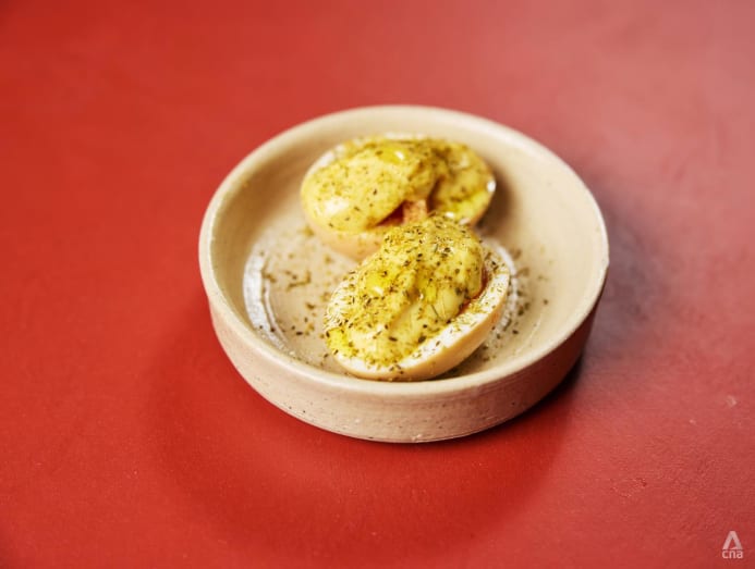 “When I think of nostalgic bars, pickled egg comes to mind,” he shared. This version is lightly pickled and served with an aioli made with English mustard; fried brioche croutons; and dill pollen dusted on top. “That's one thing I'm very happy with. I think it's a very good take on that dish.”