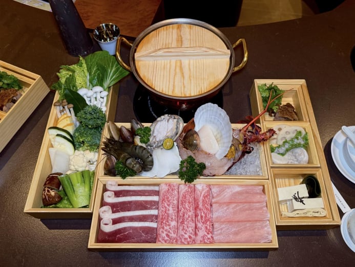 In place of communal dining, diners sit down to individual hotpots and a generous spread of fresh ingredients. There are two set menus priced at S$110 and S$138; both feature meats, seafood and vegetables, with the latter including more premium ingredients such as rock lobster and South African abalone.