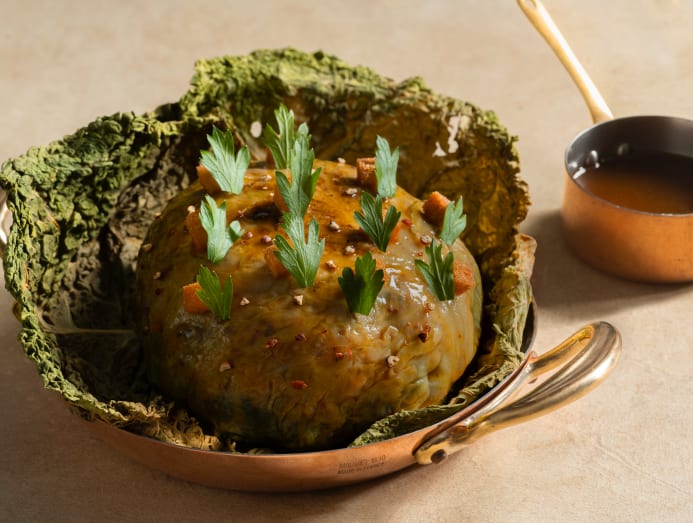 “There is a dish that is very typical for my hometown and something that I grew up eating a lot. It's called chou farci. It's a cabbage that has been blanched and then stuffed with pork,” he said. While it’s traditionally considered a humble dish of leftovers, “We add a little bit of luxury – we have a bit of foie gras here, and we balance the level of richness with a little bit of (prune). And then we put it back together and bake it”.