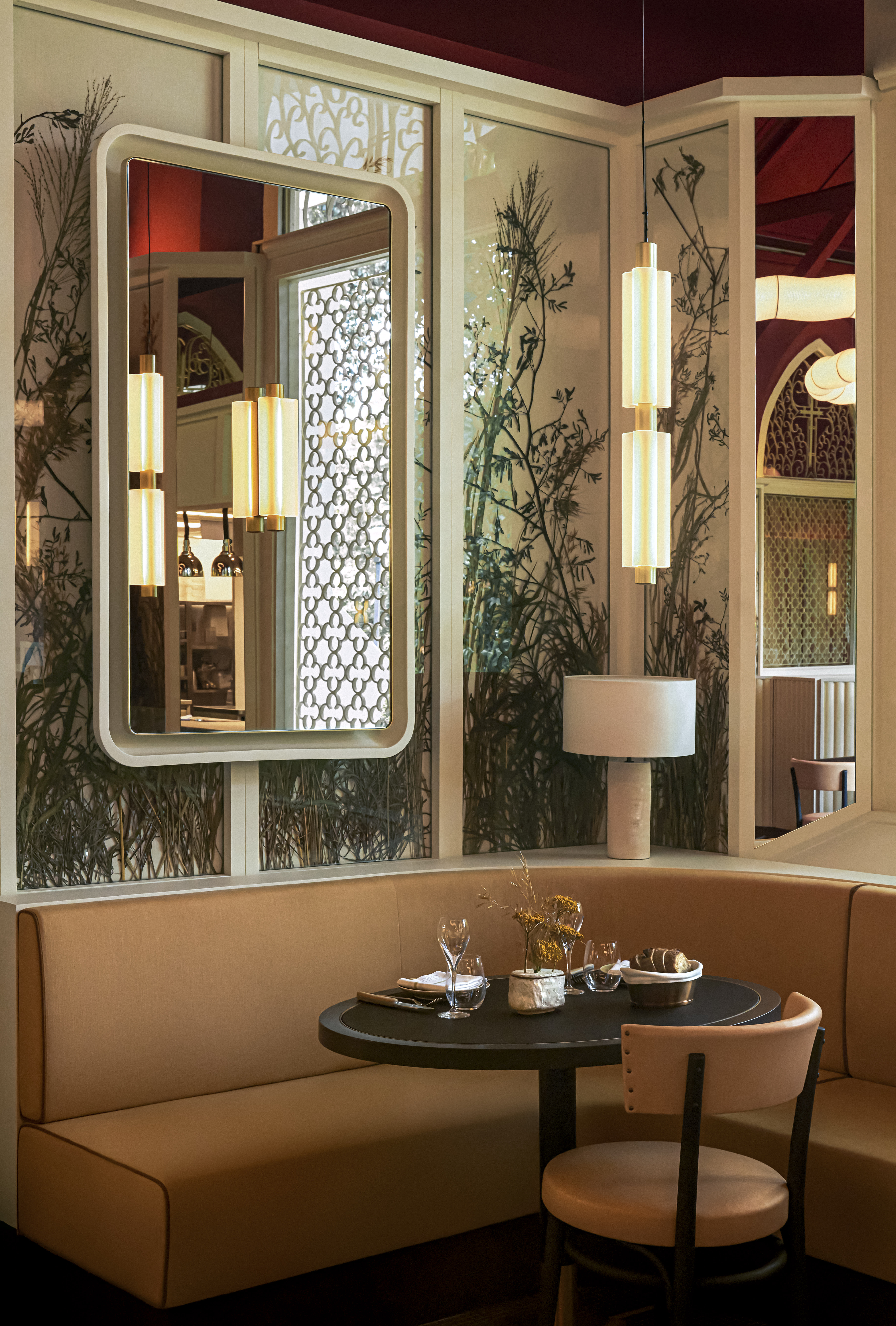 The chapel’s original elements, like its wrought-iron window grilles, are balanced out by bold design touches such as a deep red ceiling and a 15m-long decorative light snaking across the dining room, as well as mirrored lamps reminiscent of traditional French bistros and striking panels of pressed grasses.