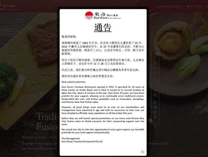 Nonetheless, East Ocean Teochew Restaurant said that it will launch special promotions on its menu and festive cakes "to thank everyone for their unwavering support over the years".