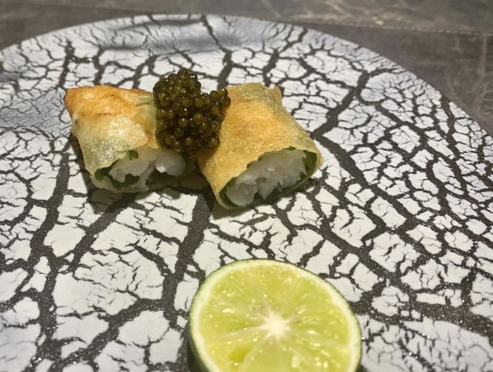 Now for a bit of crunch: Shiro ebi or baby white shrimp from Toyama, deep fried into a spring roll and brightened by the flavours of shiso and sudachi.