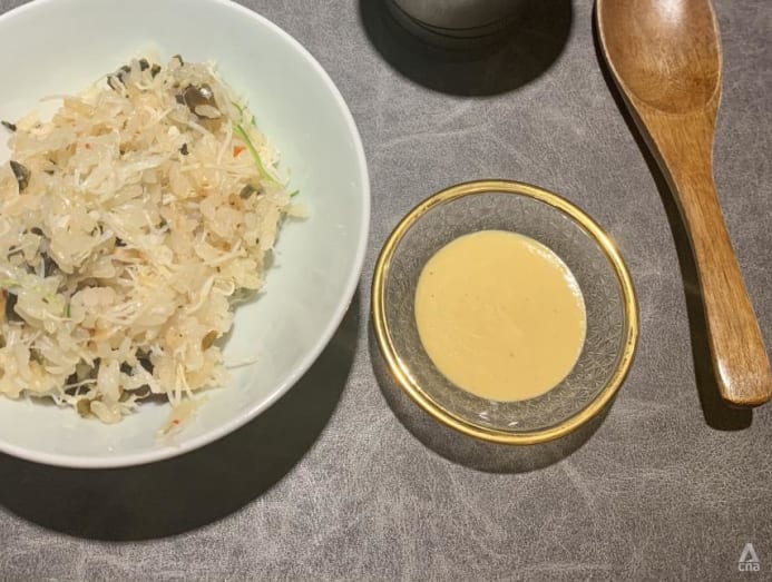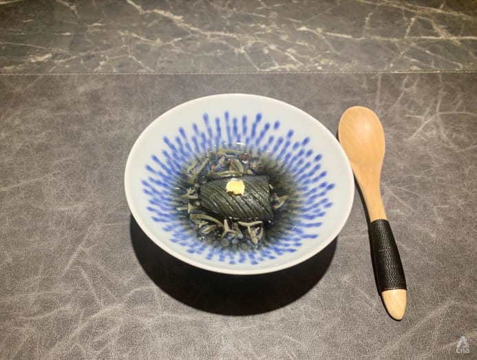 Then came a beautifully presented handroll of nodoguro grilled over binchotan, with sushi rice as well as tiny diced winter melon pickled in sake and mirin, complementing the fish’s smoky, fatty flavours.