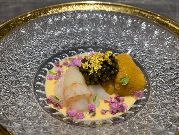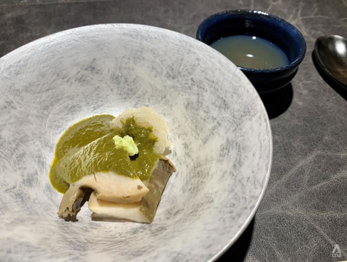 The next course of kuro awabi or black abalone from Yamaguchi allowed Araki to lift the palm-sized black beauties, steamed for four hours, out of the pot with pomp and ceremony, displaying them in the air before slicing them with his long knife in wavy motions for enhanced texture and flavour.