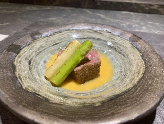 The Hida beef grilled over binchotan with Japanese asparagus would have been a treat in itself, but a sauce of fruit tomato mixed with yuba or beancurd skin took it to the next level, cutting the fat while simultaneously bringing out the sweetness of the beef.