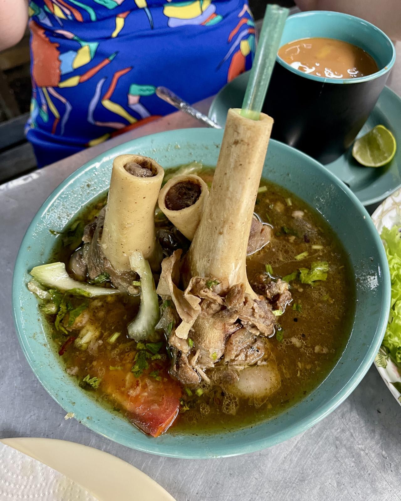 I spotted a pot of spiced mutton soup bubbling on the stove and despite our earlier seafood feast, had to try some. Known colloquially as “sup gearbox” because the knee joint bone sticking out of the bowl resembles a manual gear shift, it was sheer, steamy indulgence.