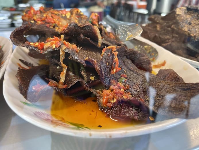 After agonising over the tempting array, I finally made my picks. Begedil (deep-fried potato patty) was the golden crown to my carefully curated plate of treasures, which I loaded with more unusual dishes I’d not tried before – gulai perut lembu (honeycomb tripe curry), gravy-drenched dendeng (dried beef) and gulai nangka (young jackfruit curry), topped with paper-thin crispy potatoes. Beef rendang and a whole sambal terung (brinjal) completed my gluttonous meal.