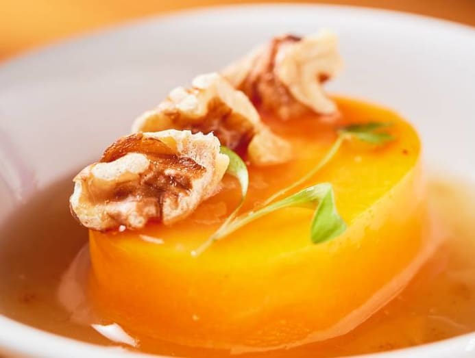 And steamed butternut squash with dried scallop brown butter, toasted walnuts and a chicken glaze made with hua diao or shaoxing wine.