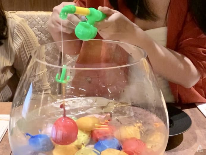 The server presented a large glass bowl of filled balloons floating in water, and we played a game of attempting to fish a balloon out with our rod.