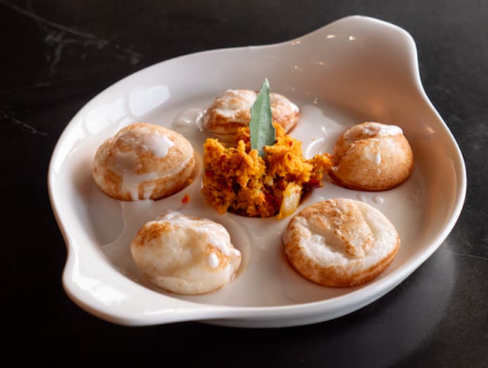 One of the most interesting dishes is the Gundappam or fat appam: Small and bouncy, these fermented rice treats are served sweet and savoury, with roasted coconut chambal and a drizzle of coconut milk.