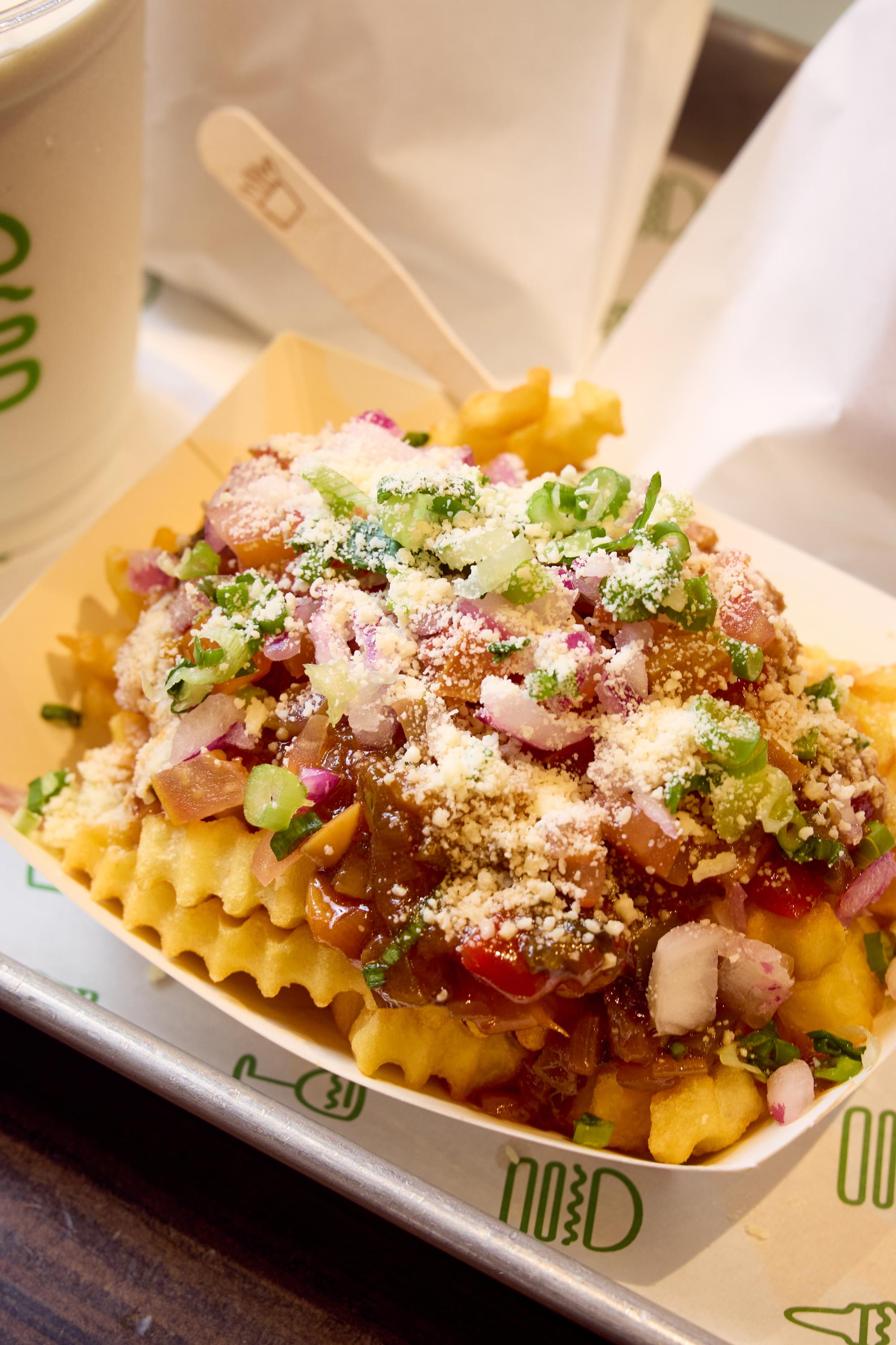 Salsa jangajji fries are his east-west mash-up: The crinkle-cut fries are topped with a hybrid between Mexican salsa and the Korean banchan of vegetables pickled in soy sauce.