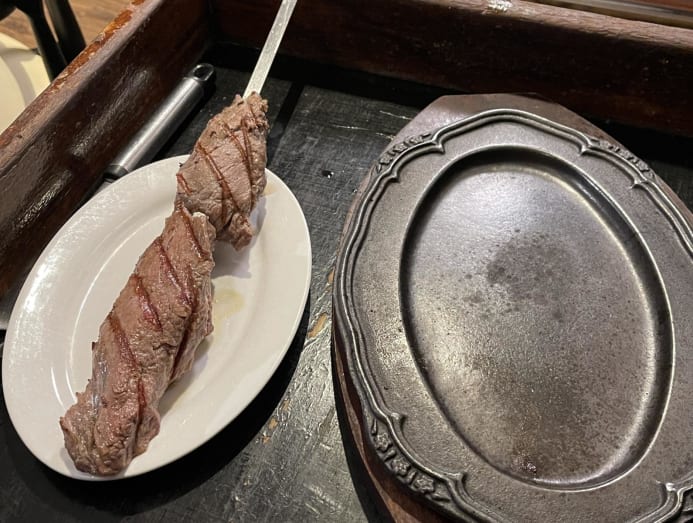 Glistening beef tenderloin, boasting distinct grill marks, is expertly de-skewered and served sizzling on a hotplate. Alan offered us these pro tips: