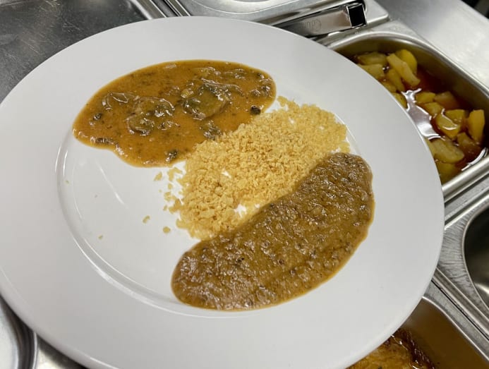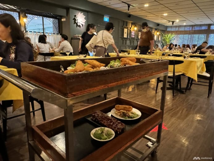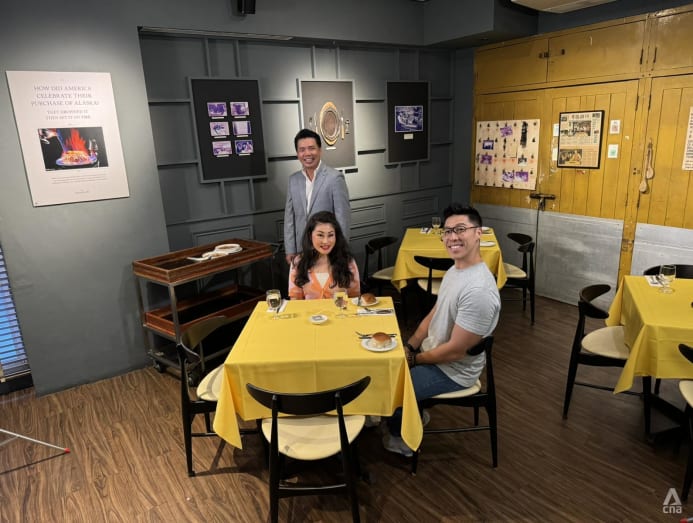 Moving on to the mains, brace yourselves for tableside theatrics. The namesake signature shashlik (S$55) arrives on a serving cart made of heavy wood, one of the few surviving relics from the restaurant’s past, along with old menus on the bartop, sepia photos on the walls and the original kitchen doors festooned with peeling signs and food safety stickers.