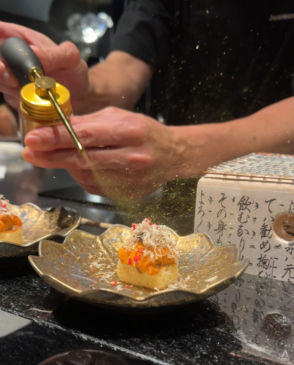 The omakase menus feeds you not just with confidently-executed skewers but also some showier techniques like covering uni truffle brioche in a puff of gold dust and using a piece of charcoal to sear scallops tableside.