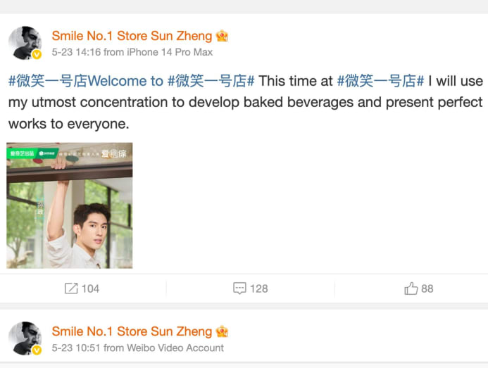 The Mediacorp actor, whose Chinese name is Sun Zheng, changed his Weibo username to “U Sweet Sun Zheng” and posted on his account about his involvement in the show on May 23. He said in Mandarin: “This time at U Sweet, I will use my utmost concentration to develop baked goods and beverages, presenting perfect creations for everyone.”