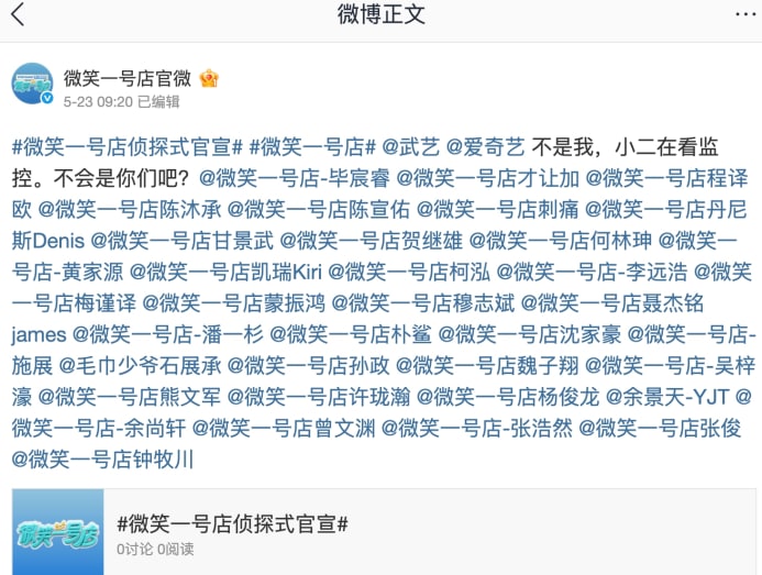 U Sweet, or Wei Xiao Yi Hao Dian, tagged the Weibo accounts of the cast scheduled to appear in the show, including Sng, and said in Mandarin: “It’s not me, the waiter is watching the surveillance cameras. Could it be you guys?”.