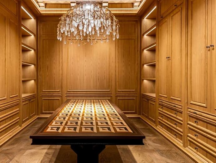 Our second showroom is a fusion of our three brands in various room settings to showcase what an entire room of customised finishes can look like: Javier’s ceiling, wall panels, cabinets and furnishings to set the tone for luxury; Serip's feature lighting to accentuate the room's ambience; and Folgie d’Oro’s wood flooring for the finishing touch.