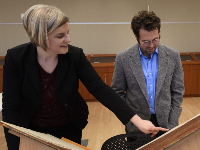 Elizabeth Pope, Curator of Books & Digital Collections, points out a writing by "E. H. Gould" at the American Antiquarian Society, a national research library of pre-20th century American history and culture, Tuesday, Jan. 9, 2024, in Worcester, Mass. Max Chapnick, a postdoctoral teaching associate at Northeastern University, believes he has found about 20 stories and poems at the library written by Louisa May Alcott under her own name as well as pseudonyms, including E. H. Gould, for local newspapers in Massachusetts in the late 1850s and early 1860s. (AP Photo/Charles Krupa)