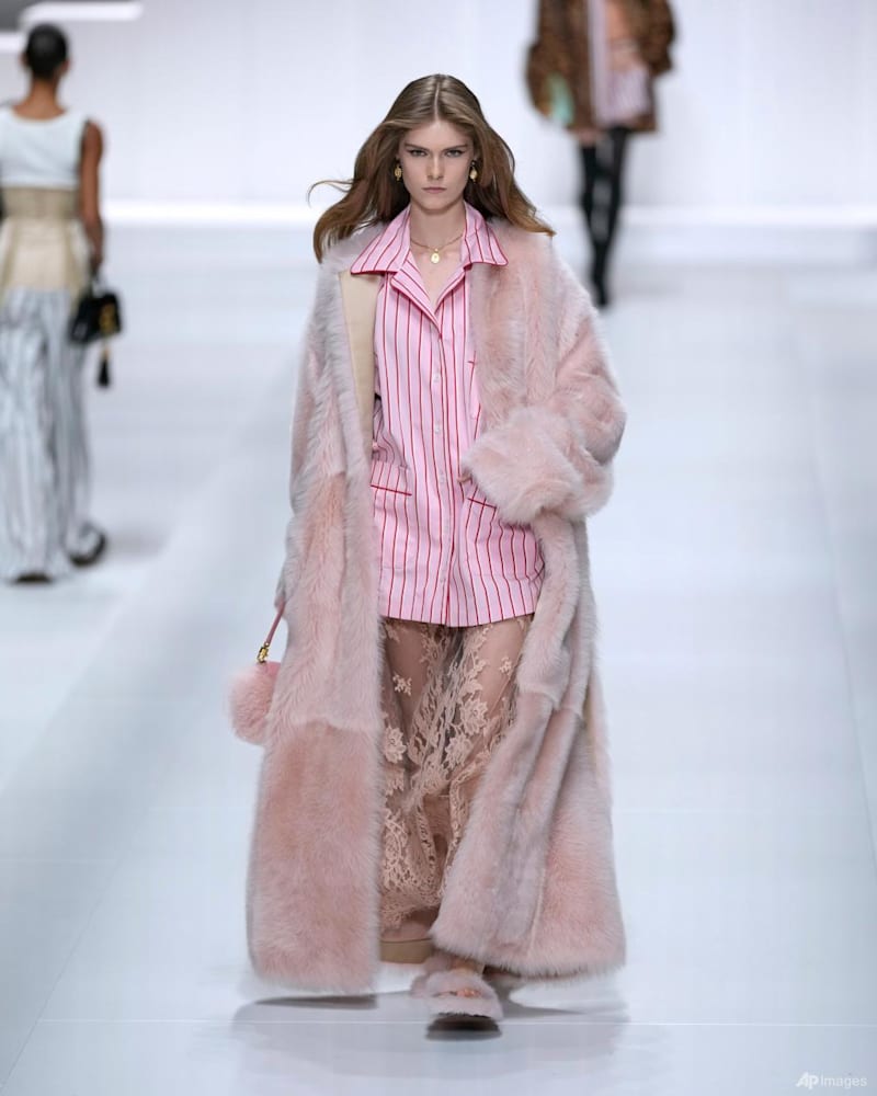 The looks were layered with jackets in leather, brocade and animal print. Footwear ranged from sexy stilettos to fuzzy slippers, and the bag of choice was soft and furry, perfect for cuddling up after a night out.