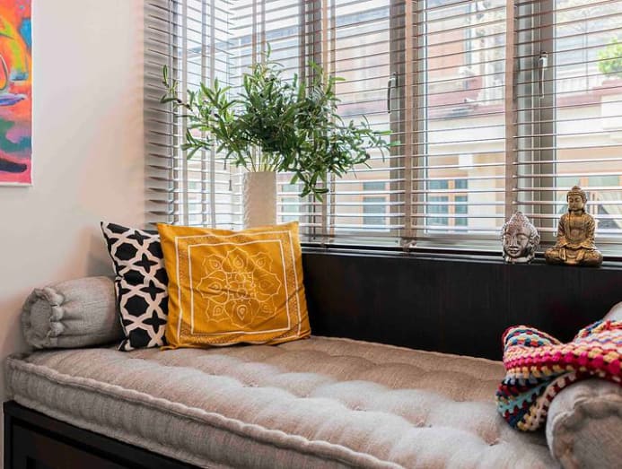 Flight attendant Bhupinder Singh relaxing at a cosy daybed nook in his condo. (Photo: The Moving Visuals Co)