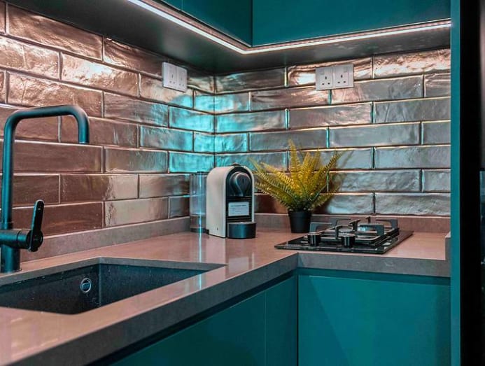 “The kitchen is a transitional space. This is where I wanted to do something different, something more exciting. These bold, teal-coloured kitchen cabinets are paired with a beautiful metallic backsplash and it has really brought a touch of luxury to the place,” said Bhupinder.