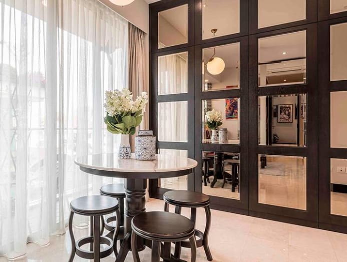 For example, a wall-to-ceiling mirrored feature wall resembling black-framed French windows was built at the farthest wall of the apartment where the dining area is, effectively creating the illusion that the apartment is twice its size.