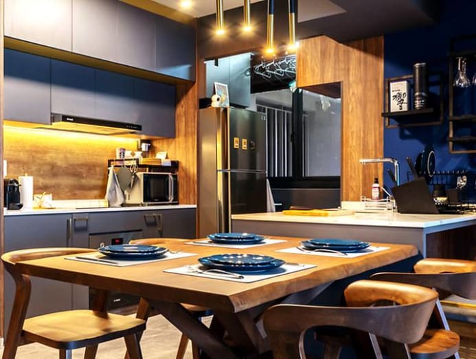 They engaged interior design firm Design 4 Space to transform their new 1,001 sq ft four-room HDB BTO flat in Woodleigh into a warm, welcoming home centred around gaming, with ample space for entertaining guests (and their doggos).