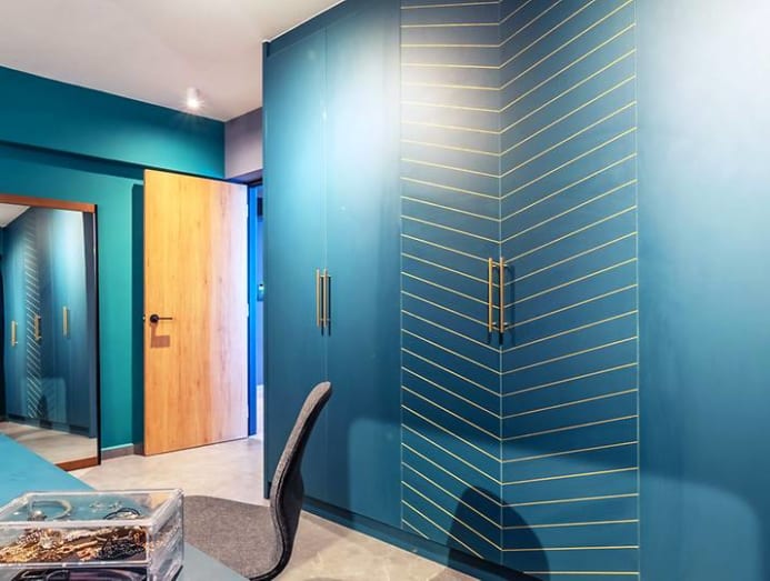 But before all these, the homeowners start off with a bold yet sophisticated style statement at the flat’s entryway: A deep brown feature wall with a large, hand-painted chevron design in gold, which also hides the bomb shelter door.