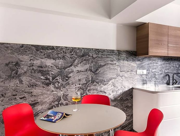 A grey marble slab that runs the length of the shared wall between the open-concept kitchen and dining areas adds a touch of luxe and drama, while uniting the two spaces. It also serves as a backsplash for the kitchen – and as a backdrop against which his red dining chairs pop.