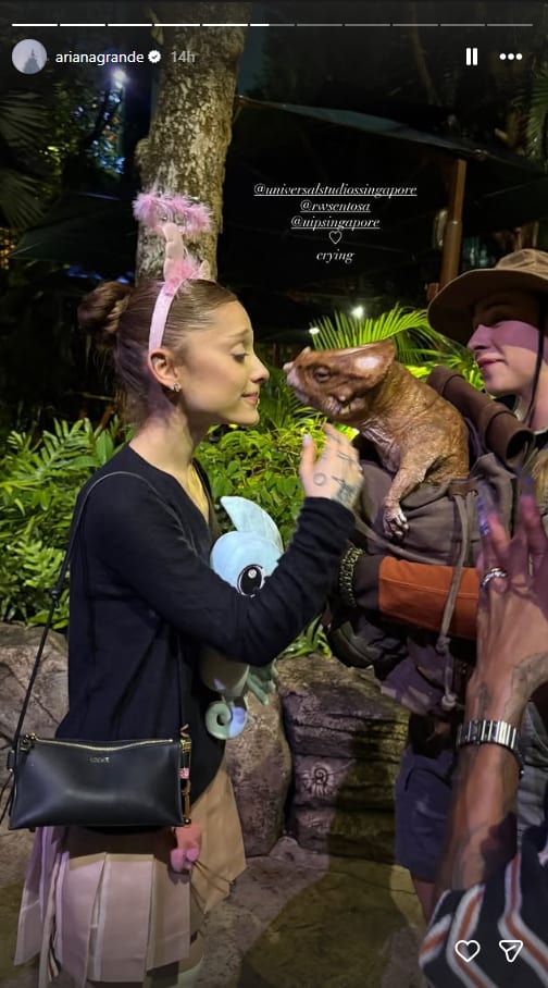 In one clip taken at The Lost World zone, Grande, who plays Glinda, got up close with an animatronic baby dinosaur, captioning the video "crying". The tender moment was immediately broken when the baby dinosaur made a noise and Grande nearly fell backwards in shock.