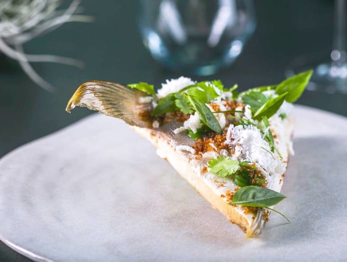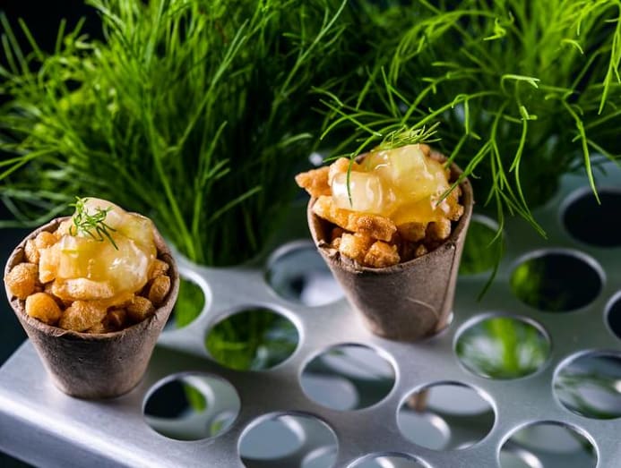 The series of moreish amuse bouche follows with Air Baguette, manchego cheese puff topped with cheese jelly and truffle gel; and Pork Crackling, rendered in a mini cone and stuffed with diced apple and vinegar.