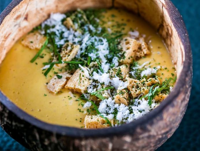 Fans of Clift’s progressive cooking at Tippling Club will be pleased to find some familiarity in the culinary direction at V Dining. The lunch menu kicks off with a snack of laksa mousse topped with fried taupok, dehydrated laksa leaves, and coconut cream all served in a coconut bowl – a deconstructed rendition of the local favourite laksa.