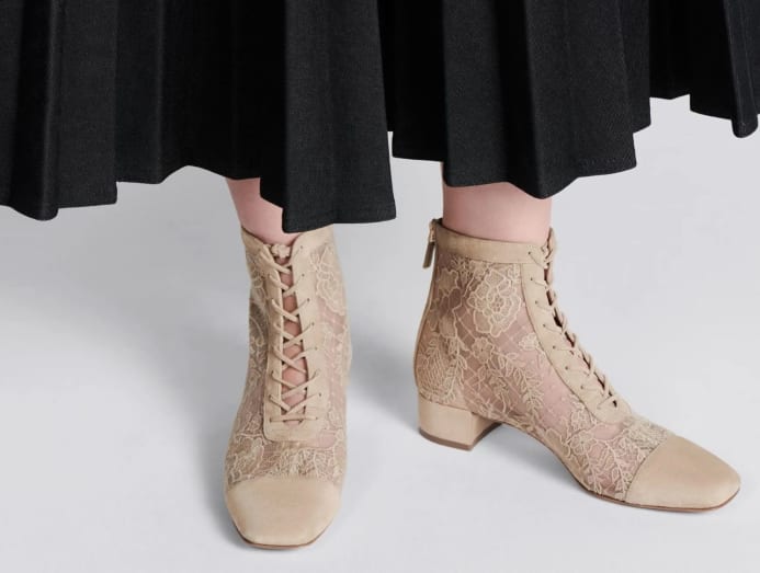 This flirtatious ankle boot is like lingerie for the feet. It features signature Dior embroidery on a transparent mesh, capped at the toes and topped with sand-coloured suede to complete the illusion. The sensual design is also highly breathable and takes away the traditional tongue for an even more open design. And there's no need to worry about lacing up either. The shoe has a rear zipper so you can easily slip in and out of it. Complete the look with a dress that finishes above the ankle to really show these off.