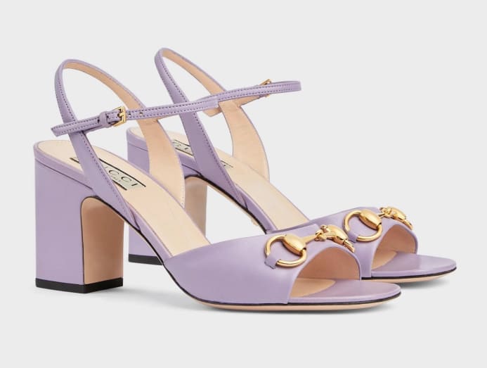 This elegant strappy number is a charming way to herald Spring with its supple lilac leather. It contrasts the beautiful soft colour with a gold-toned Horsebit hardware – an emblematic House symbol to glam things up – and the shoe is secured with a similar gold-toned ankle buckle on the side. The sleek lines make this sandal chic, but a generous stable mid-heel means you needn't sacrifice comfort. As you walk from house to house, you'll be the envy of others all day – and night – long.