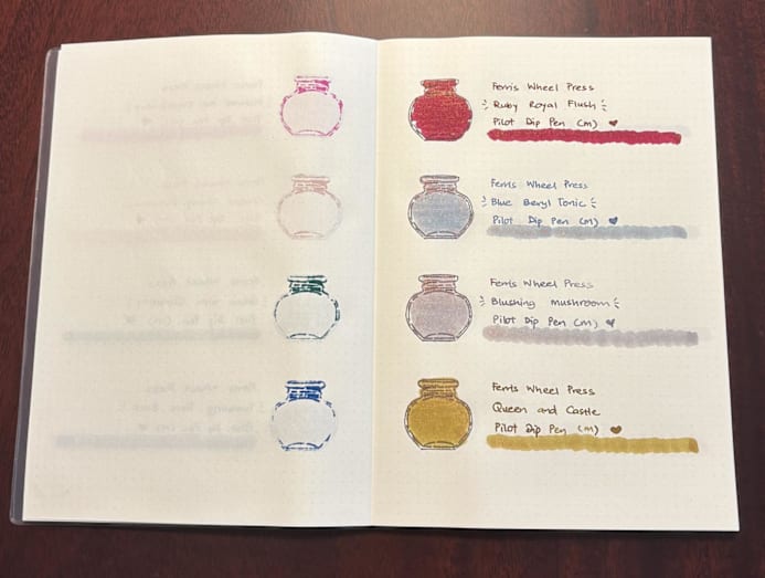 And if he does write with them, Lee also has a comprehensive collection of ink bottles. He and his wife even created a notebook full of ink swatches, which they refer to when refilling or dipping their pens.