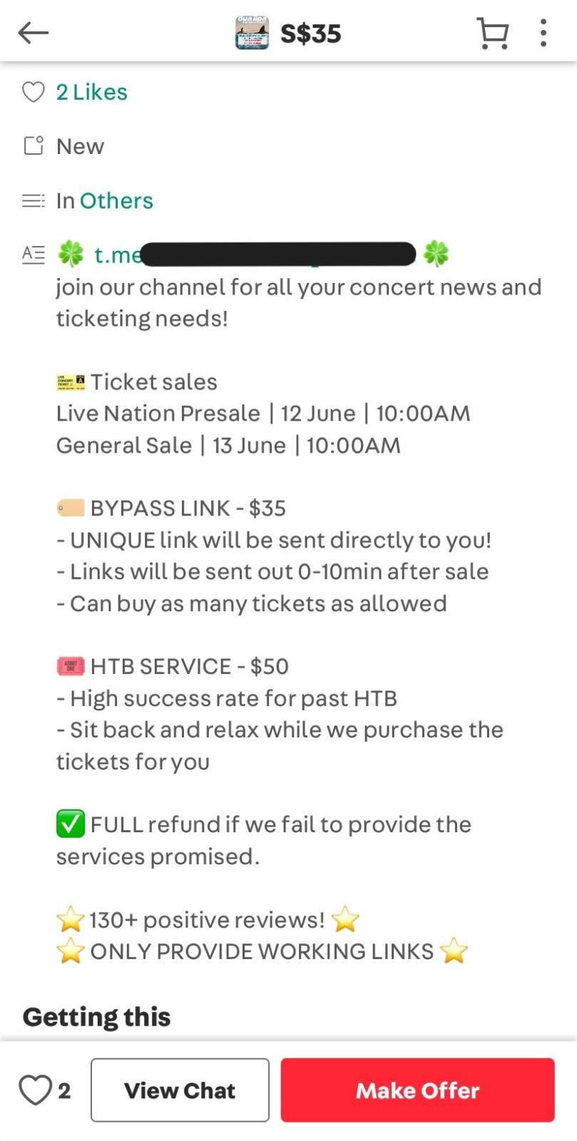 After all, if a buyer is able to secure four VIP tickets during their session using a “magic link” for which they paid S$80, for example, each ticket would have only cost them an additional S$20. This is “a win for them”, said Eric.