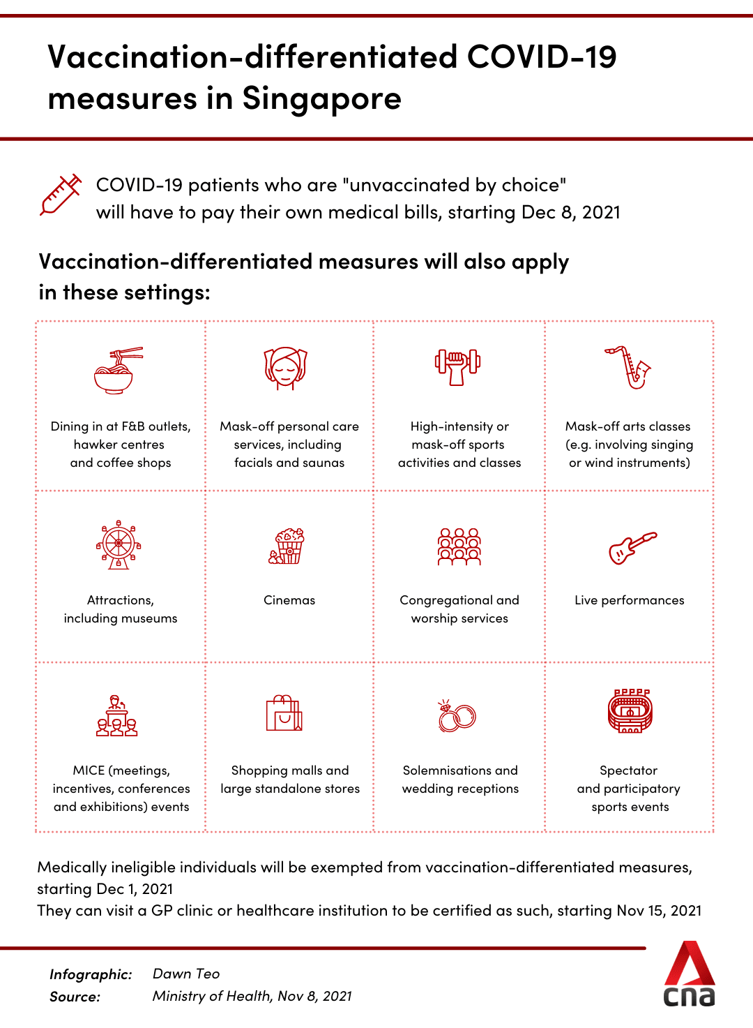 SINGAPORE: From Dec 8, all COVID-19 patients who are unvaccinated "by choice" will have to pay their own medical bills if they are admitted to hospitals or COVID-19 treatment facilities, the Ministry of Health (MOH) said on Monday (Nov 8).
