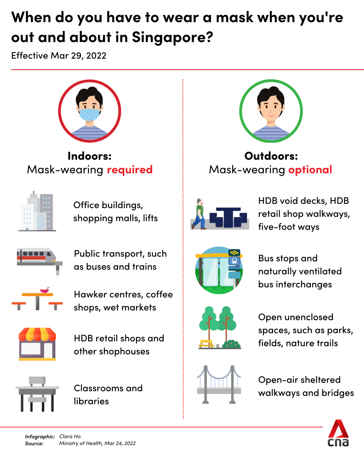 SINGAPORE: A raft of COVID-19 measures will be relaxed on Tuesday (Mar 29), including one that will make it optional to wear a mask outdoors. But it appears not everyone is raring to rip off that face covering that has become one of the most visible markers of the pandemic.