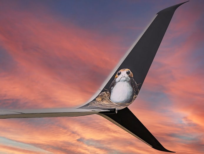 Aptly unveiled on May the 4th this year, Alaska Airlines’ creatively named Star Wars Transport to Disneyland Resort has livery depicting the Millennium Falcon in a dogfight with TIE fighters. It also has porgs on its wingtips.
