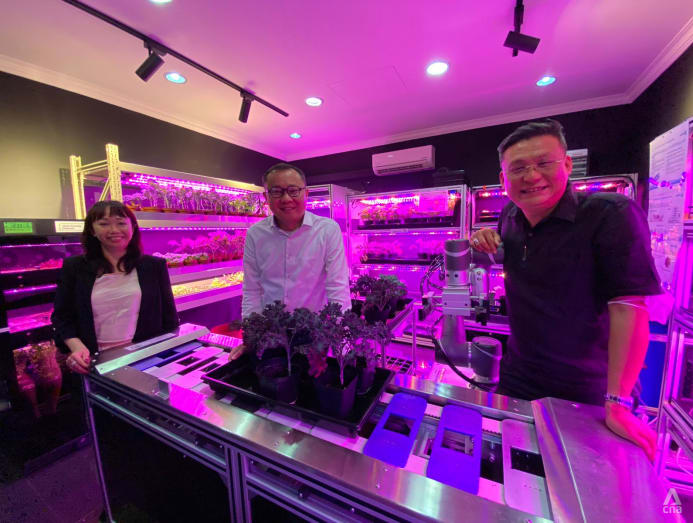 SINGAPORE: In a small room tucked away on the second floor of a precision engineering factory in Tuas, pots of kale and lettuce stacked in vertical racks grow under the glow of pink-purple lights.