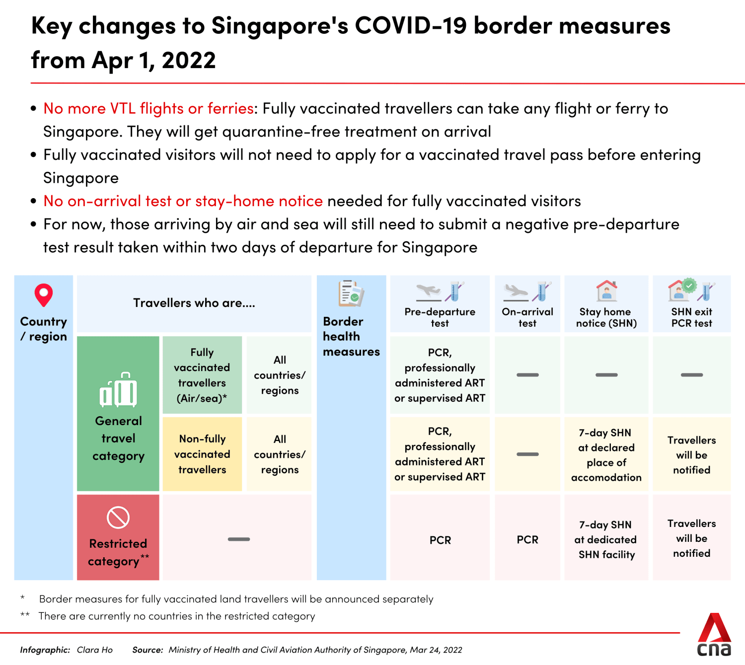 SINGAPORE: Singapore will reopen its borders to all fully vaccinated travellers, removing all existing vaccinated travel lanes (VTL) and unilateral opening arrangements from Apr 1, the Civil Aviation Authority of Singapore announced on Thursday (Mar 24).