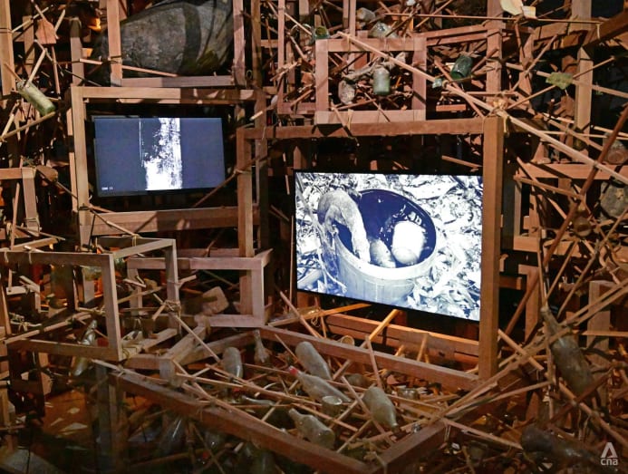 Then, two massive screens in the middle of the room crackle to life, igniting the dark space with evocative scenes and sounds. A rubbish bin left behind by migrant workers serves as a watering hole for migratory birds; a wild boar giving birth; deafening sounds of an excavator clearing a forest.