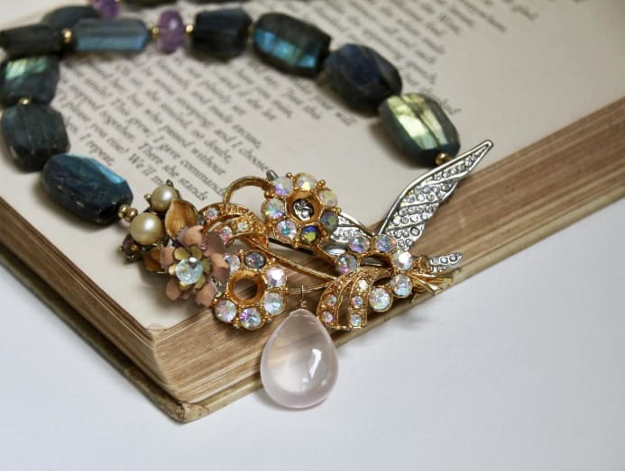 Under my handmade line, it’s a statement necklace I made for myself for my sister’s wedding. It’s made of various vintage parts and gemstones. I made it in 2012 and still love it so much.