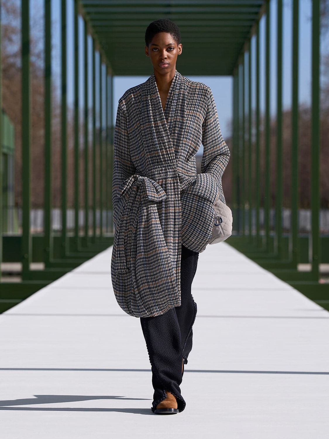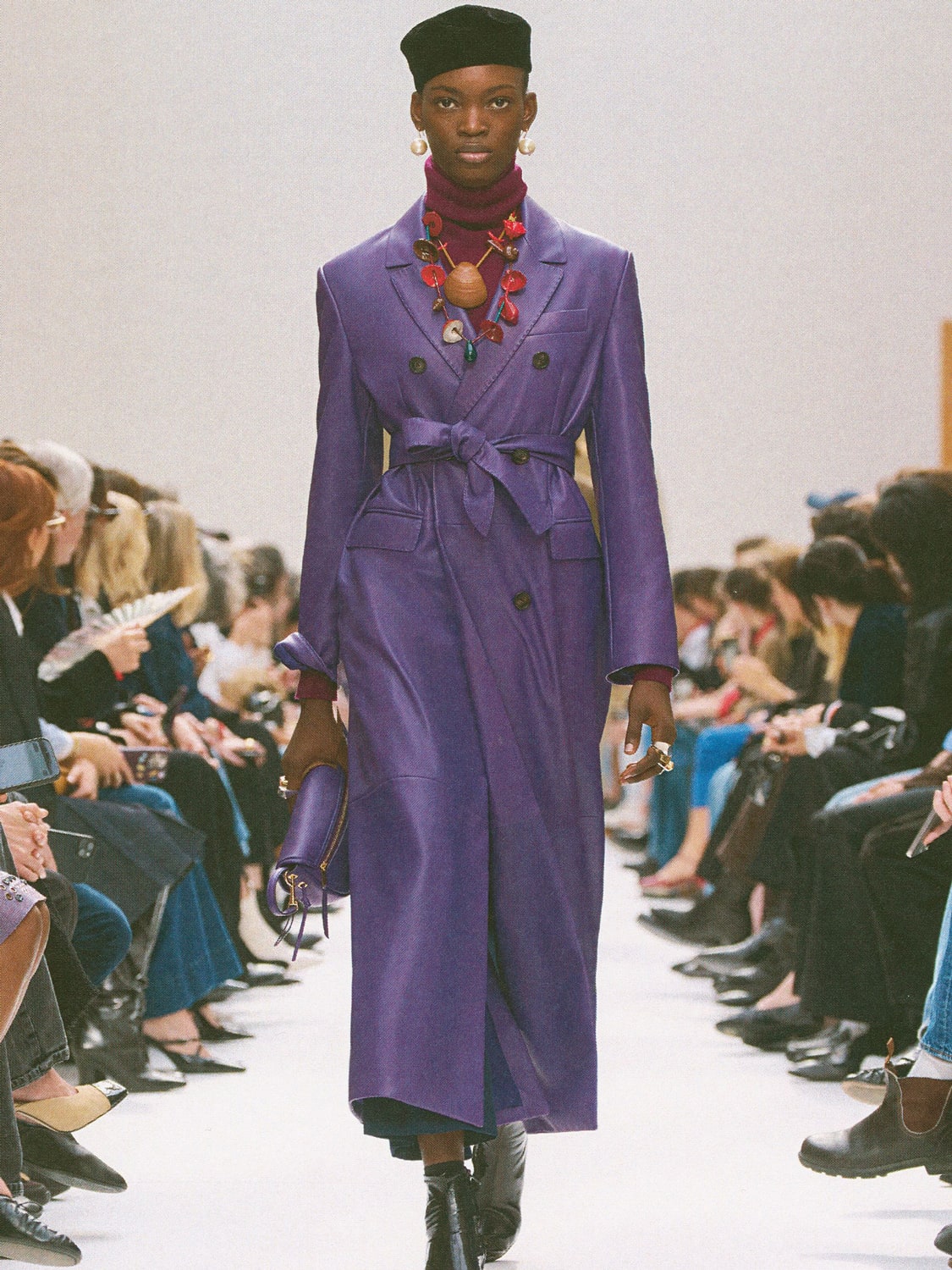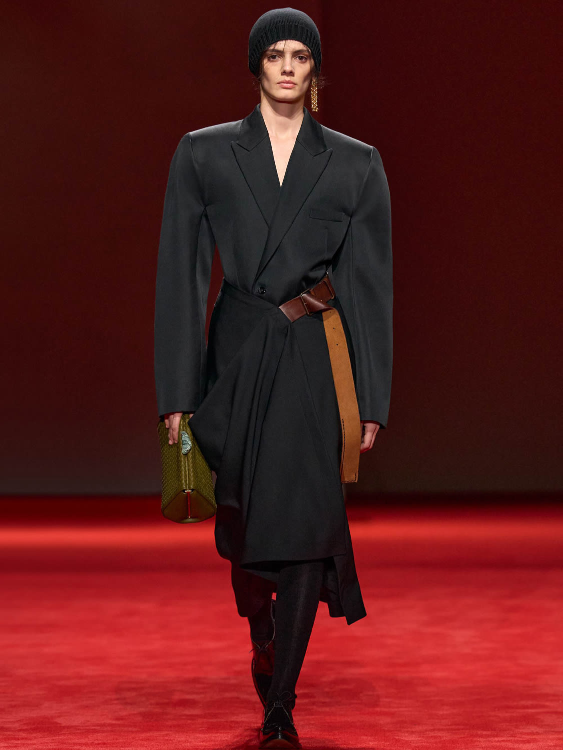 Oversized coats appeared in vivid faux furs crafted from silk, felt and recycled fibreglass. Leather trenchcoats featured woven and ridged patterns. Intrecciato bags returned in ostrich and croc finishes. Soft beanies and embellished headpieces completed the looks, reinforcing Trotter’s vision of clothes designed for the many roles modern women inhabit.